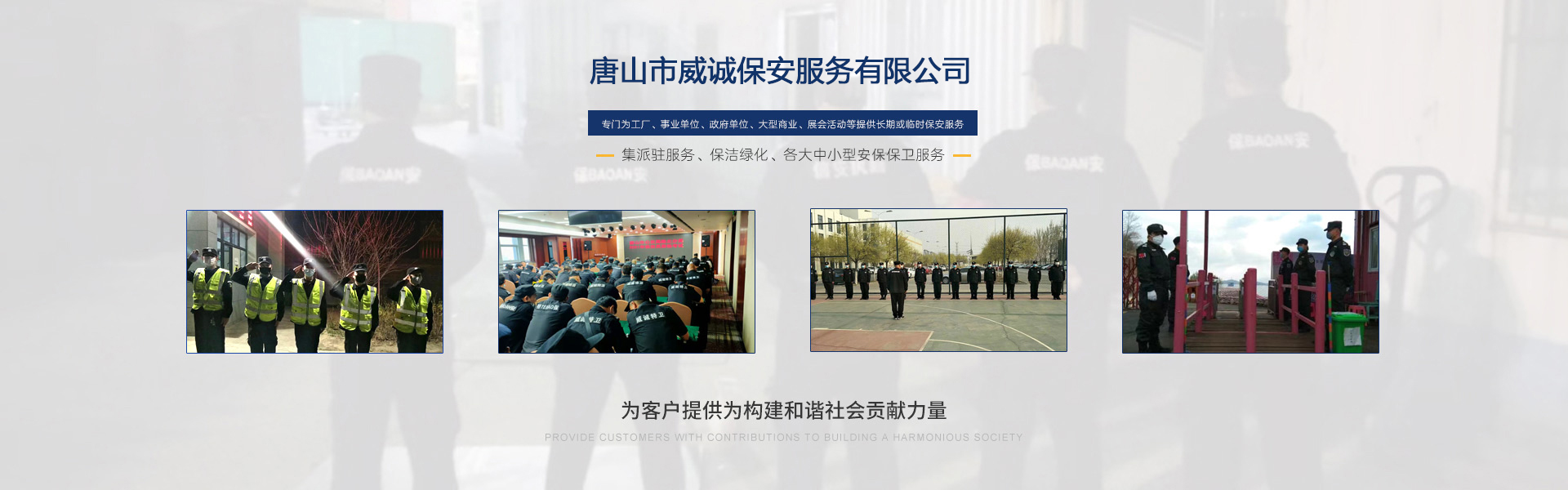 唐山市威誠保安服務(wù)有限公司自成立以來以“嚴(yán)防死守、忠于業(yè)主”為服務(wù)原則,以“客戶滿意、 合作共贏”為根本目標(biāo)。以科學(xué)的管理、多方位多層次的服務(wù),建立了首問責(zé)任制,完善了走訪、回訪 、滿意度調(diào)查、末位淘汰的預(yù)警管理,不斷提高服務(wù)質(zhì)量,提高業(yè)主滿意度,提高企業(yè)形象。秉承“誠 實守信,紀(jì)律嚴(yán)明,團(tuán)結(jié)協(xié)作,致精致誠”的服務(wù)理念,為客戶提供高品質(zhì)、多方位、專業(yè)化的保安服務(wù)。 本公司制定了嚴(yán)謹(jǐn)?shù)亩ㄏ蛘猩徢芭嘤?xùn)、考核錄用、崗中培訓(xùn)、持續(xù)培訓(xùn)、末位淘汰制等一整套完善的管理體系。可以根據(jù)客戶的要求實地勘察評估,以量身定做的方式提供安保防范服務(wù)。